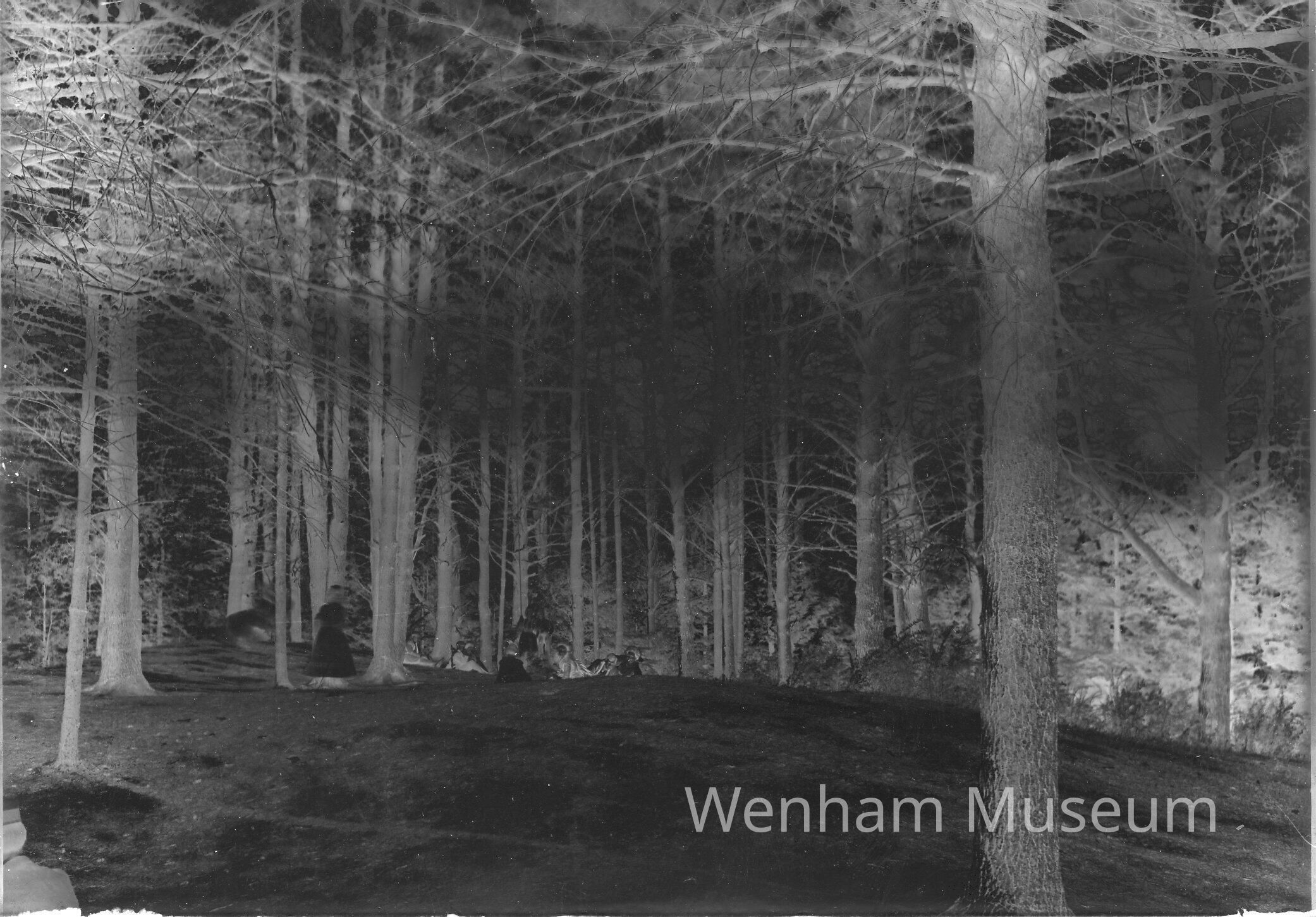 Idlewood Lake, Hamilton/Wenham, people relaxing on the shore in a wooded grove. Photo taken by A.B. Norton about 1910.