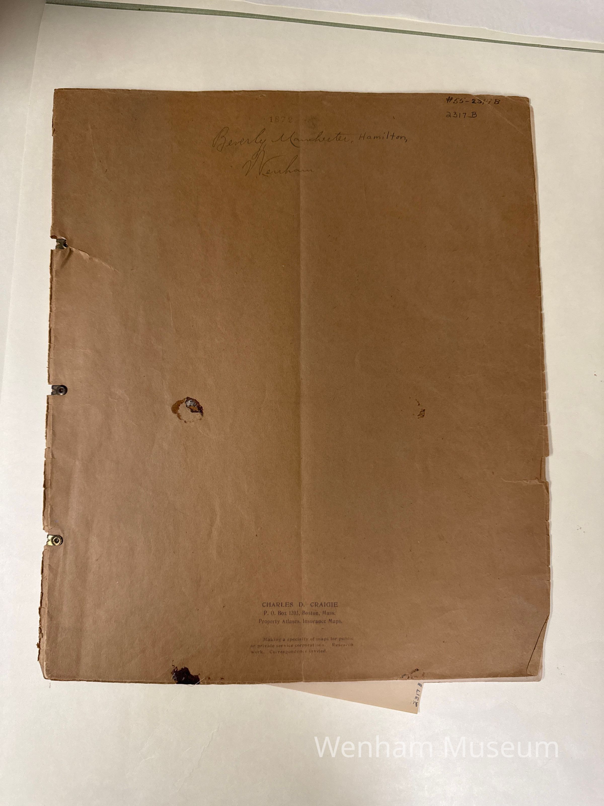 Card: 16 1/2 X 14. Property atlases, insurance maps from Beers Atlas of 1872, Beverly, Manchester, Wenham, encased in brown paper.