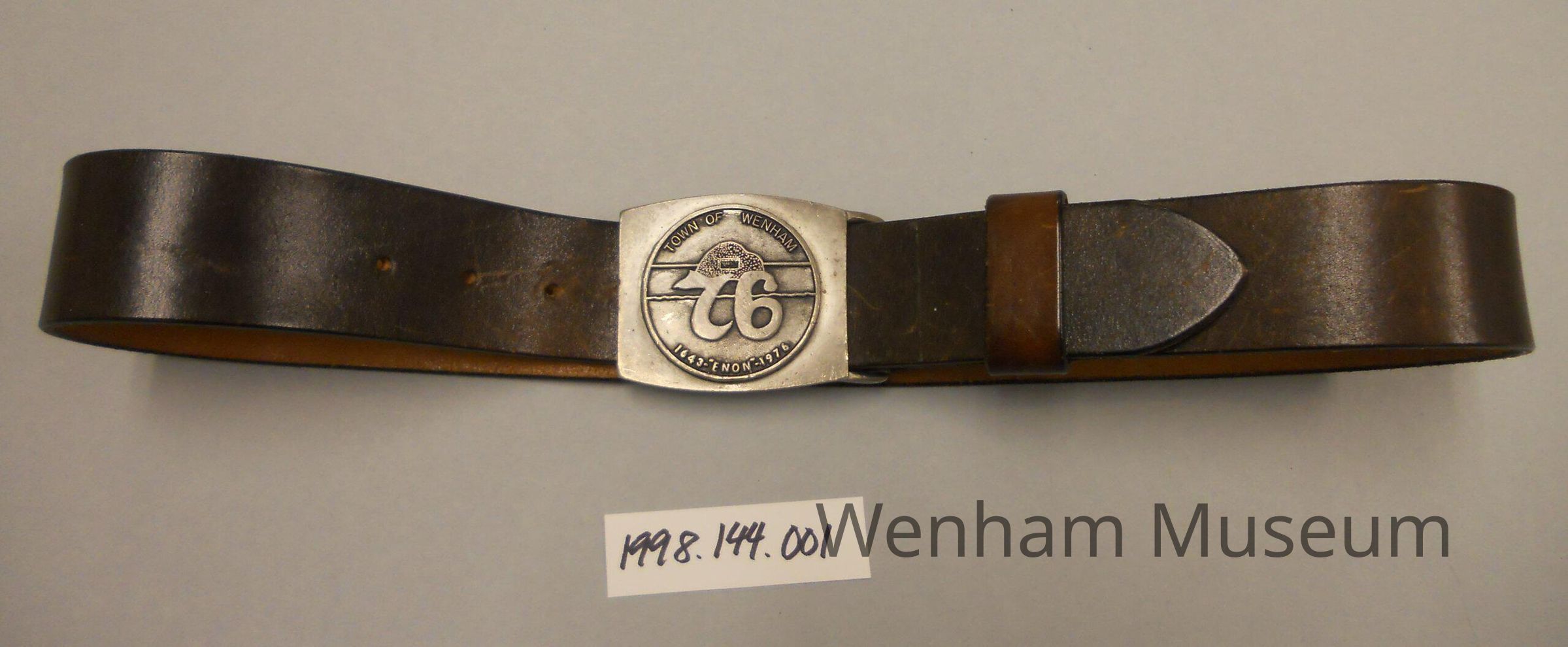 Brown cowhide belt with large caste metal bicentennial buckle featuring Wenham with founding date (1643) and bicentennial (1976). Closes with hook and hole.