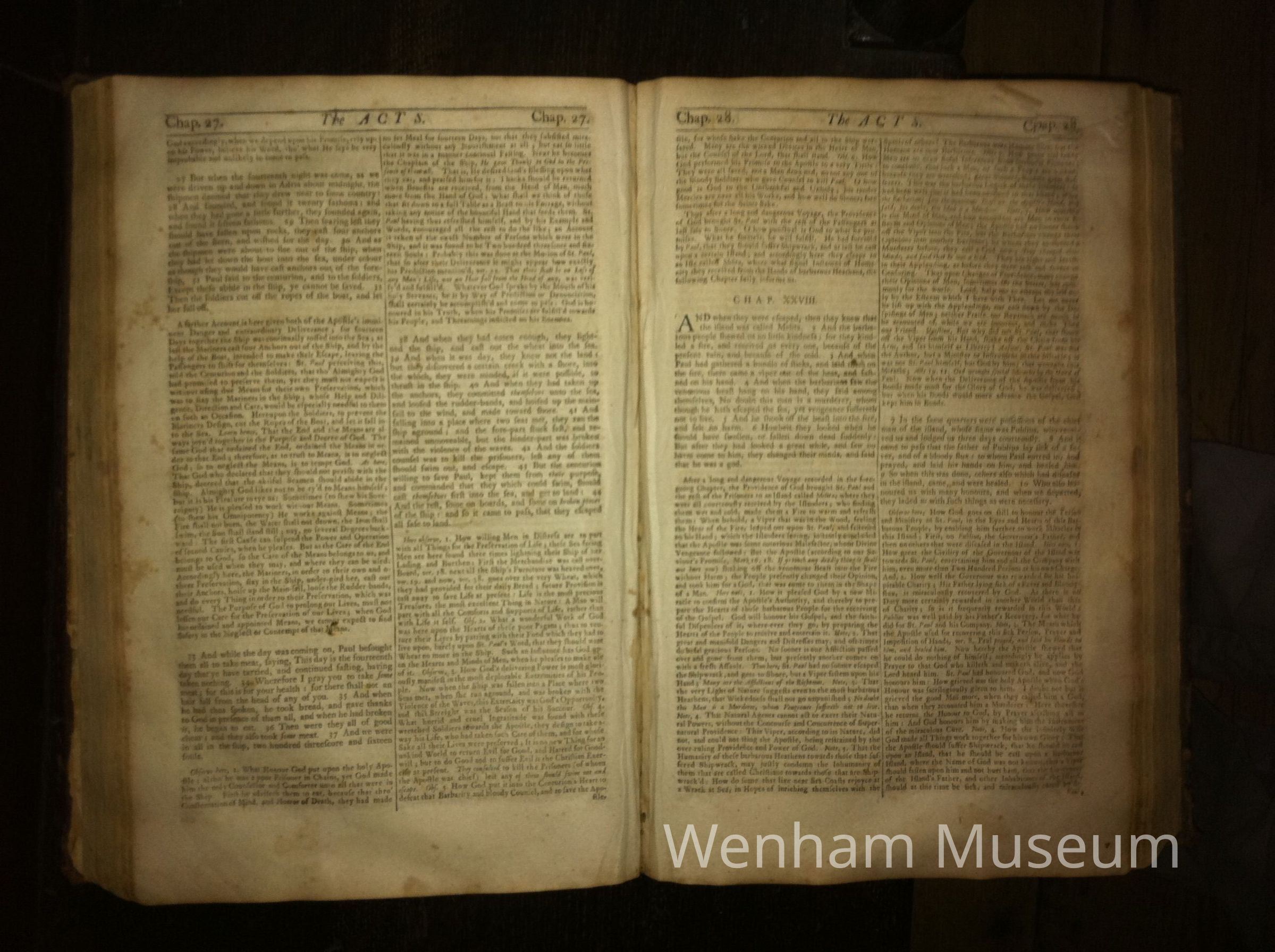 The Bible belonged to Rev. Joseph Swain (1723-1792) who was ordained in Wenham October 24, 1750 and ended his pastorate when he died in Wenham on June 29, 1792 (42 years as minister). The Bible was bought at auction in 1792 by Abraham Dodge.