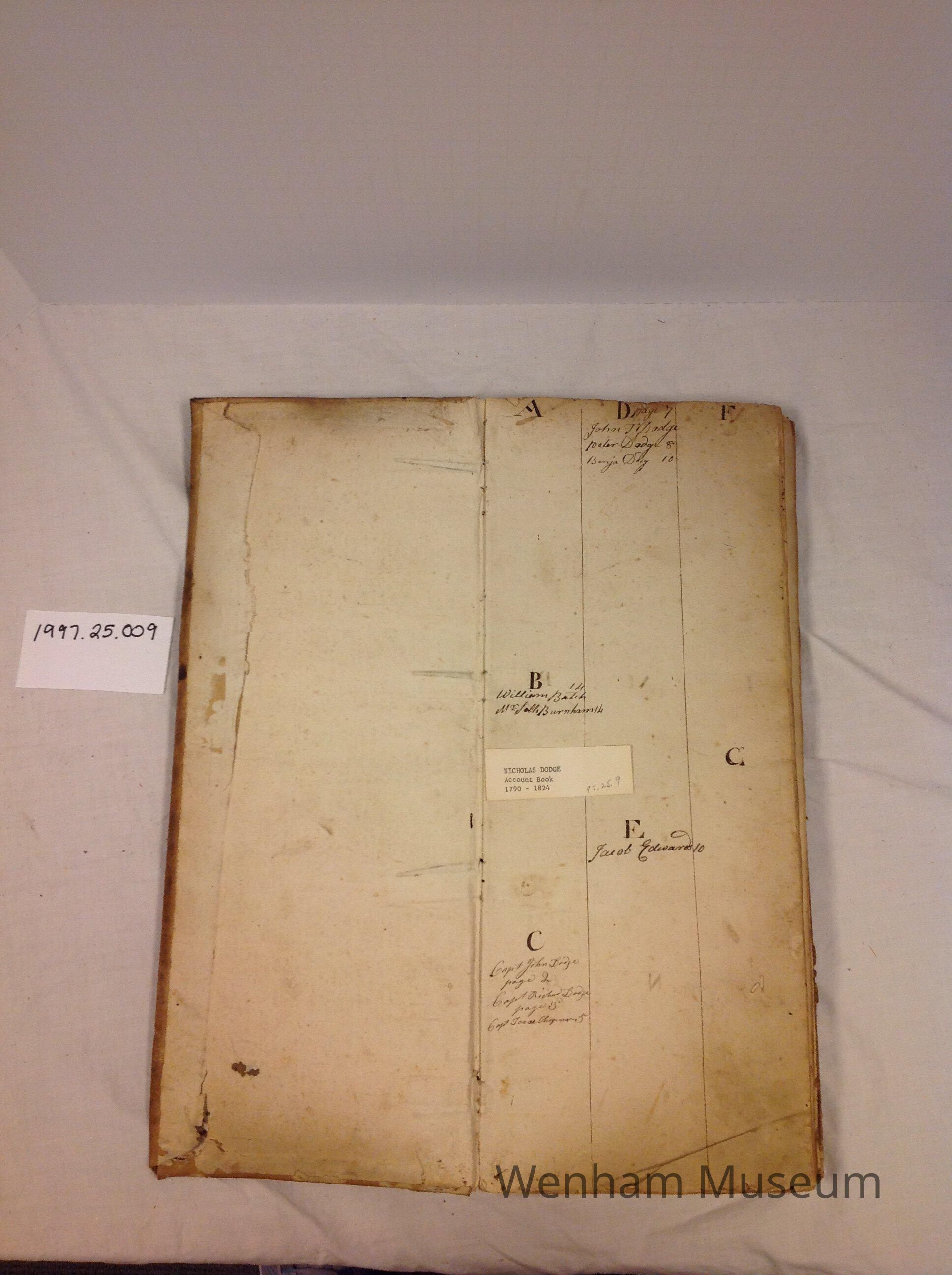 Parchment Account book ledger belonging to Nicholas Dodge encompassing the years 1790 through 1824. Detailed alphabetical glossary of the names and corresponding page numbers is included at the beginning of the ledger.