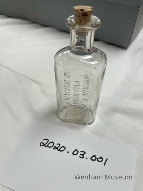 Clear glass bottle with lip, square shoulders and flat - rectagular shape. Cork stopper. "HORAGE E. ANDREWS/PHARMACIST/WENHAM DEPOT, MASS"