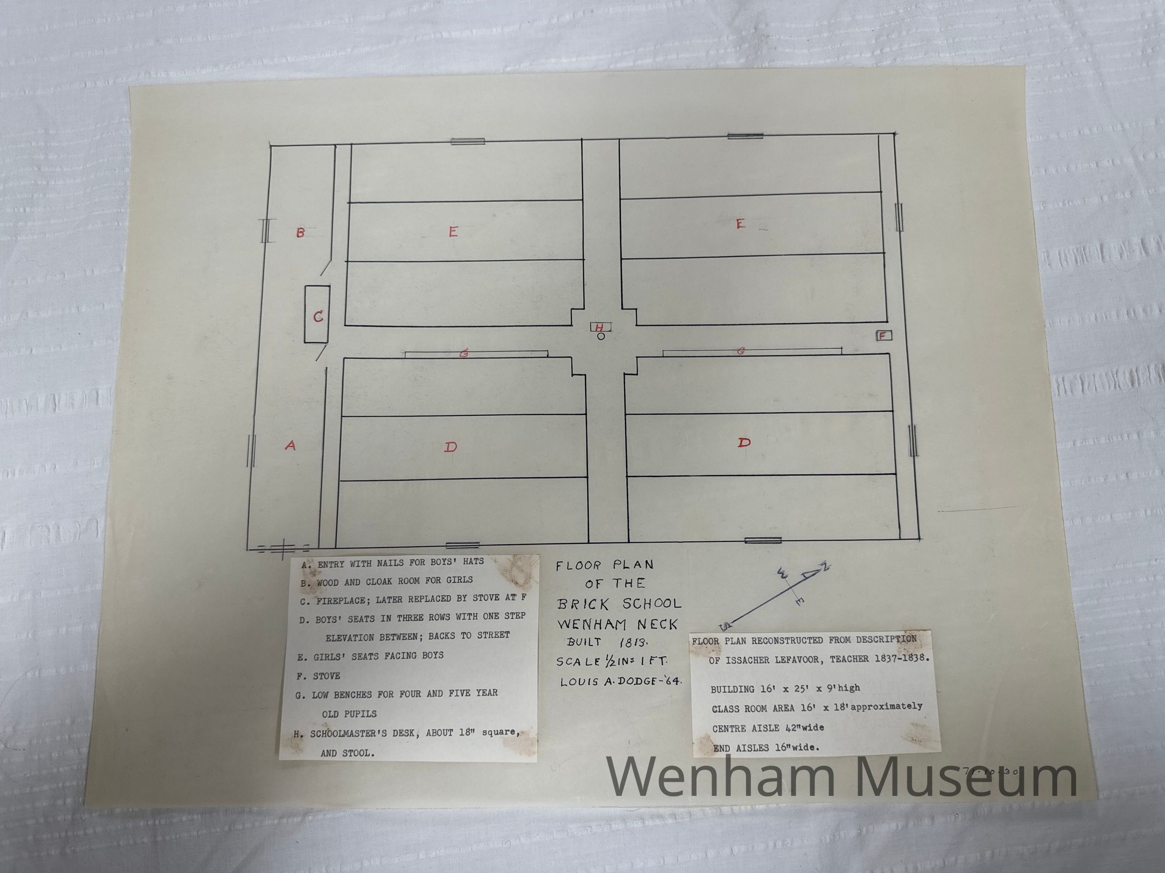 Floor plan of the Brick School Wenham Neck built 1813. Plan drawn by Louis A. Dodge, 1964.