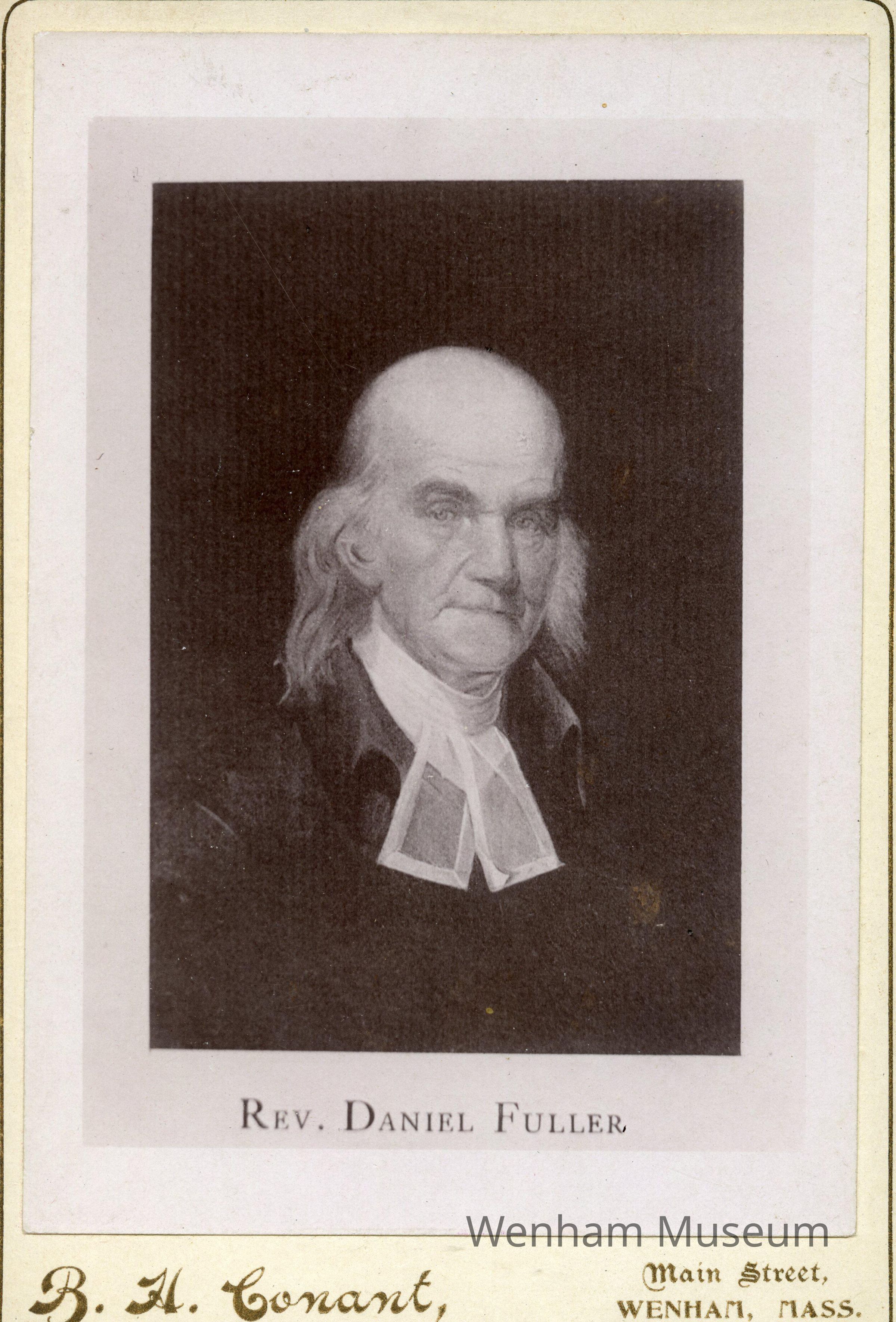 Photograph of a print, of Rev. Daniel Fuller, bottom front, in gold, "B.H. Conant / Main Street, / Wenham, Mass."