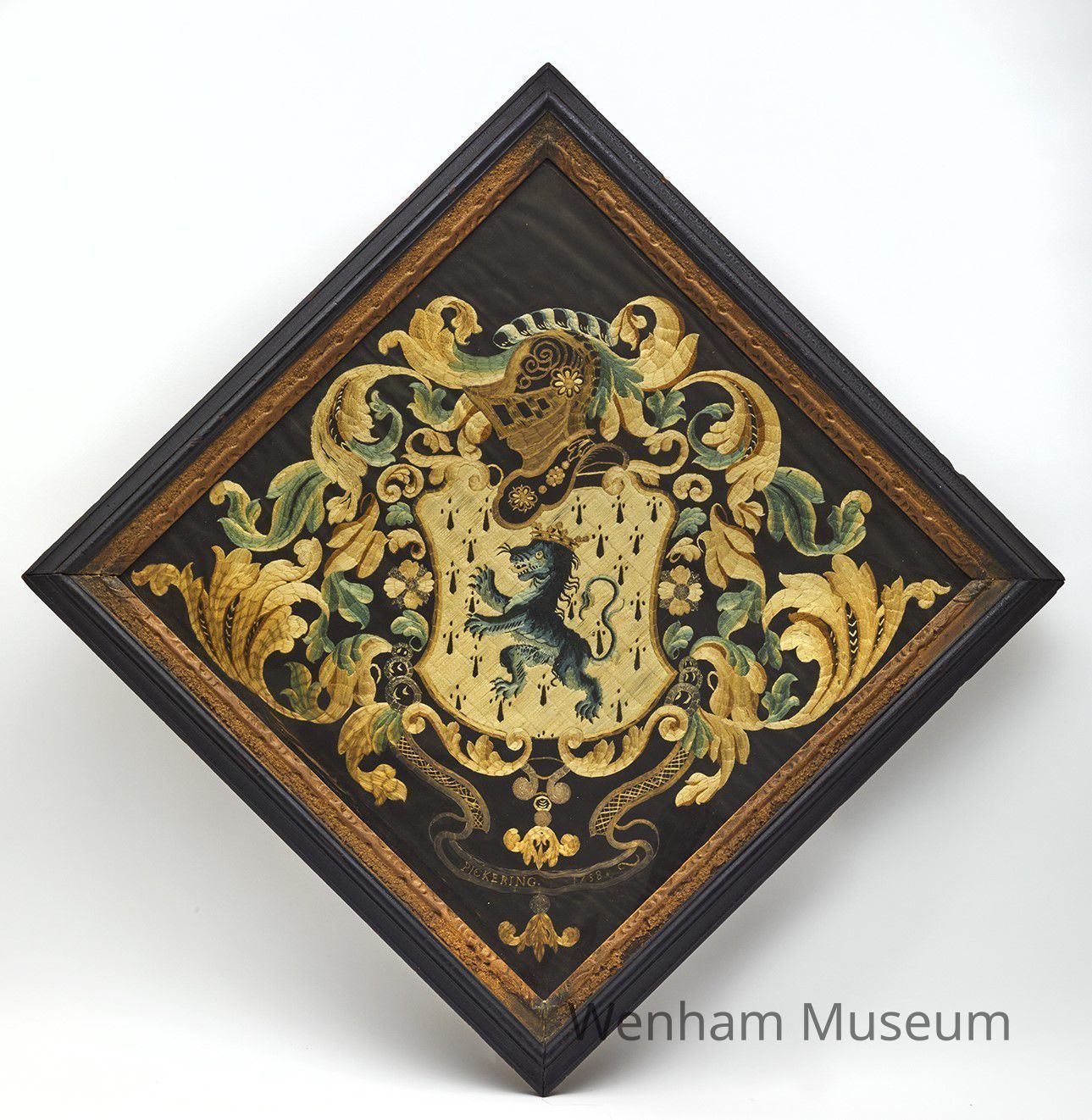 Embroidered coat of arms of the Pickering family worked in a variety of tones of off-white, beige, blue, and black silk floss and bullion on black silk, set on the diagonal and framed with wood under glass. The coat of arms is a blue lion rampant, wearing a crown, on a cream colored ground that is scattered with a variation of ermine tails in black; an embroidered banner below the shield reads "PICKERING. 1758."; the shield is surrounded by fantastical flowers and leaves and topped with a visored helmet.