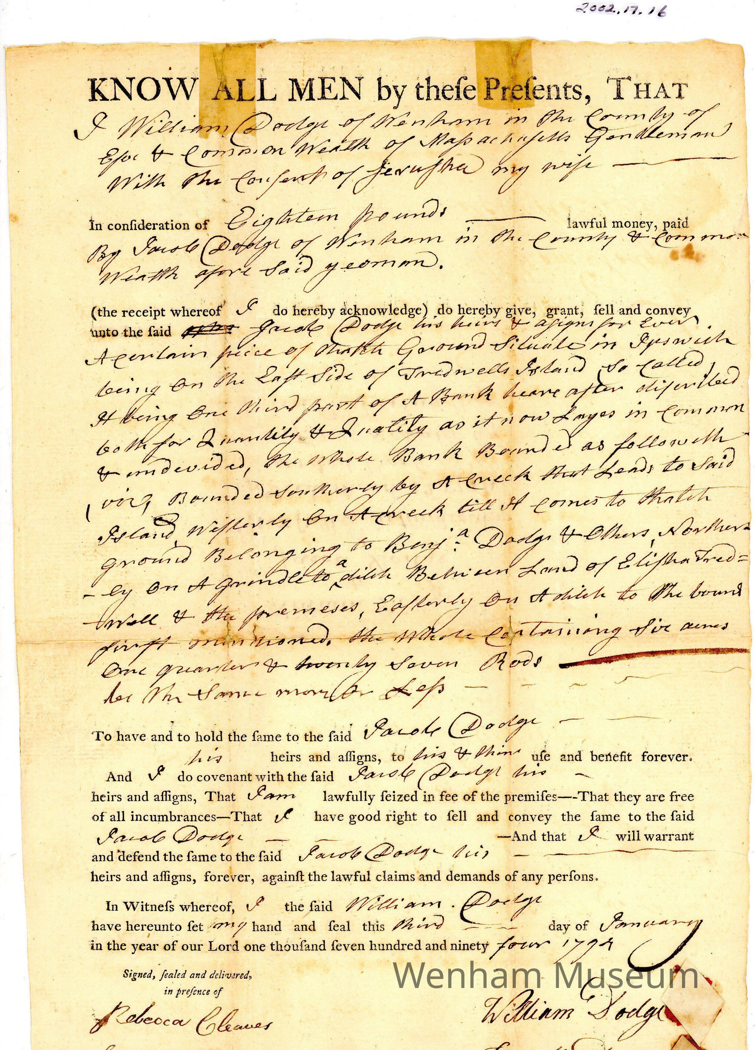 1794 deed William Dodge to Jacob Dodge a piece of thatch ground in Ipswich on the east side of Treadwells Island.