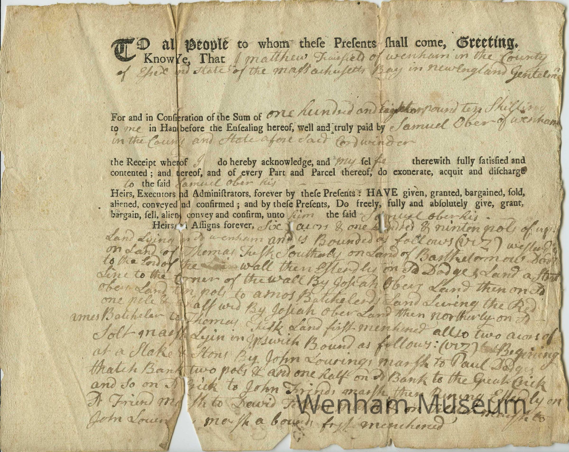 A deed of land bought by Samuel Ober from Matthew Fairfield for 180 pounds and 10 shillings. Date unknown but probably prior to 1780.