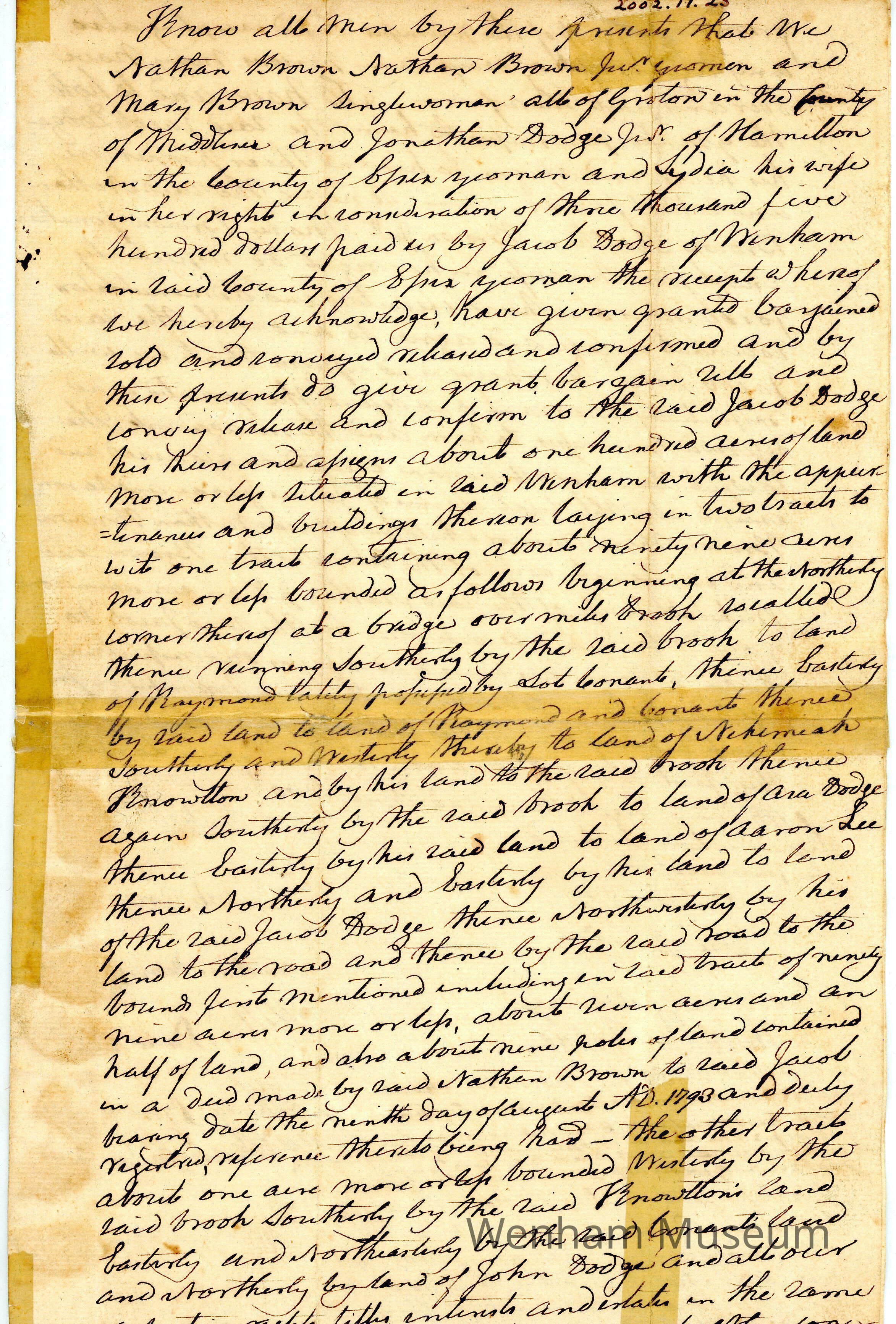 1802 deed from Nation Brown and others to Jacob Dodge for 100 acres in Wenham with buildings and appurtenances.