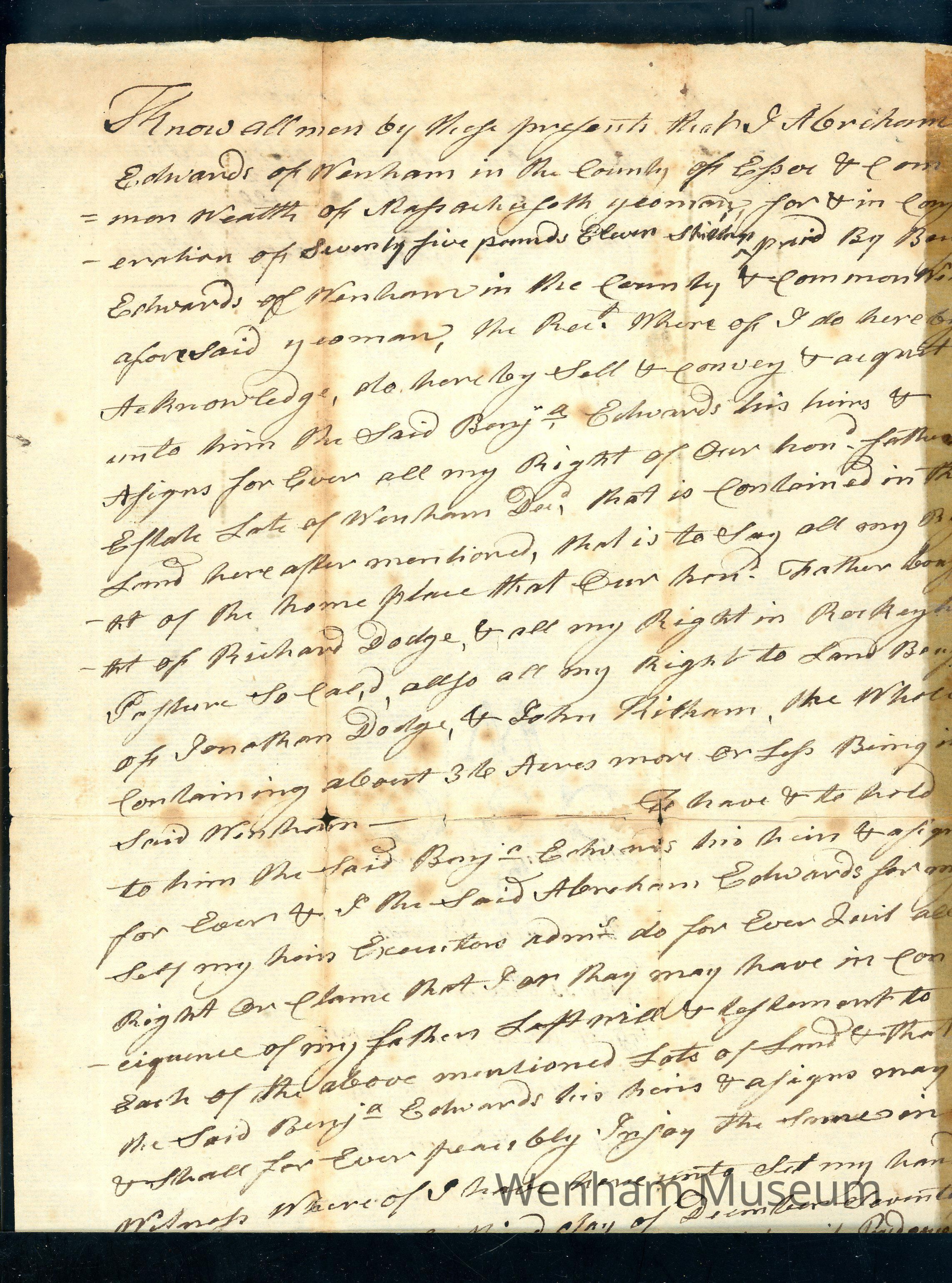 3 December 1795 deed between Abraham Edwards, yeoman of Wenham to Benjamin Edwards (brothers) for 36 acres of "the home place" that their father bought from Richard Dodge all right in Rocky Hill pasture also land bought of Jonathan Dodge and John Kilham. Abraham Edwards was paid 75 pounds 11 shillings for the property.Collection