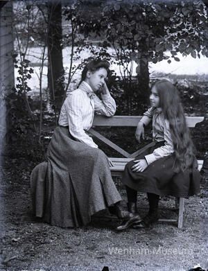 Helen Patch and Georgie Williams sitting outside on a bench. The girl has very long hair.