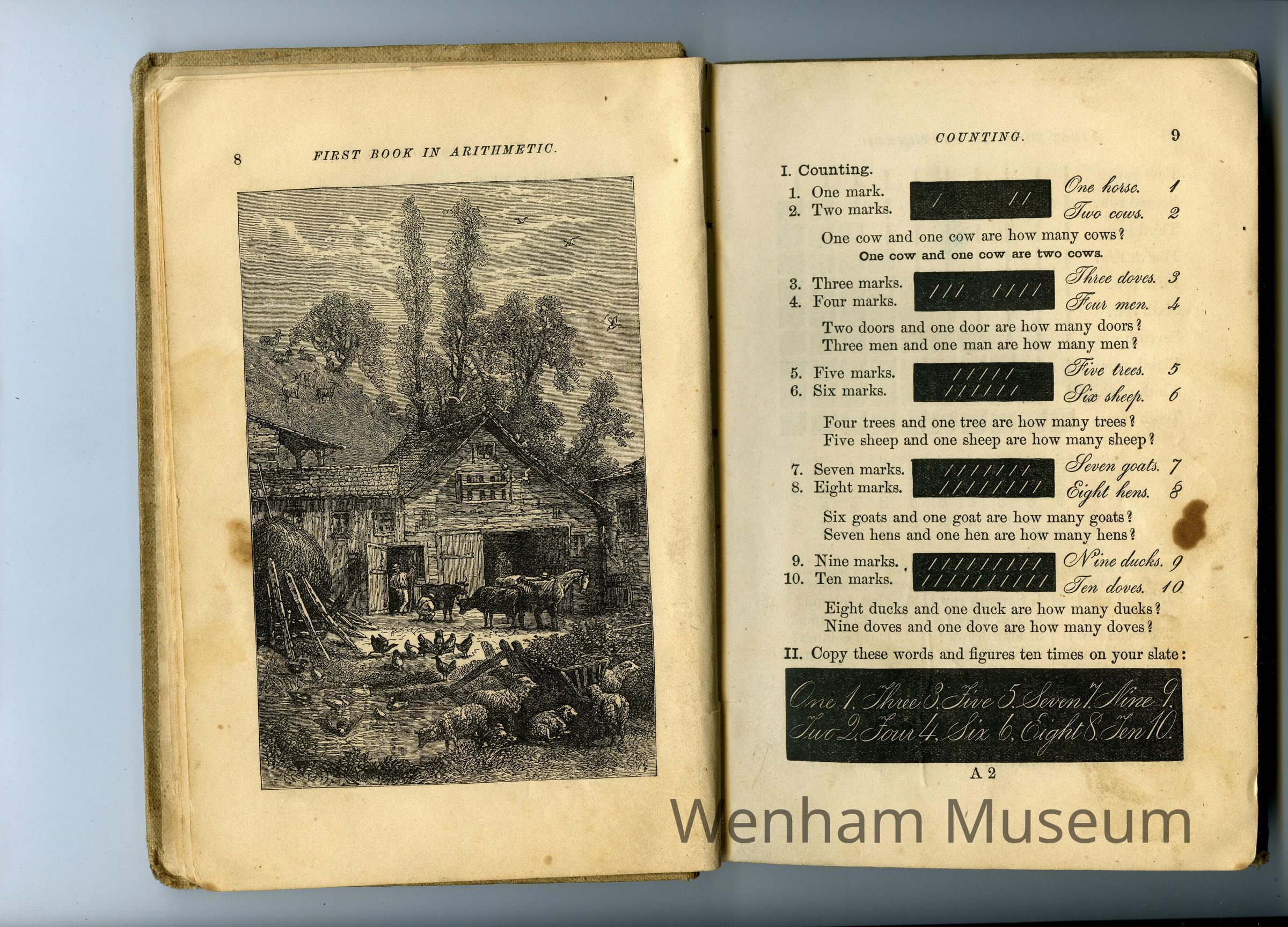 Textbook, First Book in Arithmetic comprisinf two years of oral and written work in the elements of numbers. Published in New York: Harper & Brothers, Franklin Square. 1888. The book was most likely used in the Wenham school system.