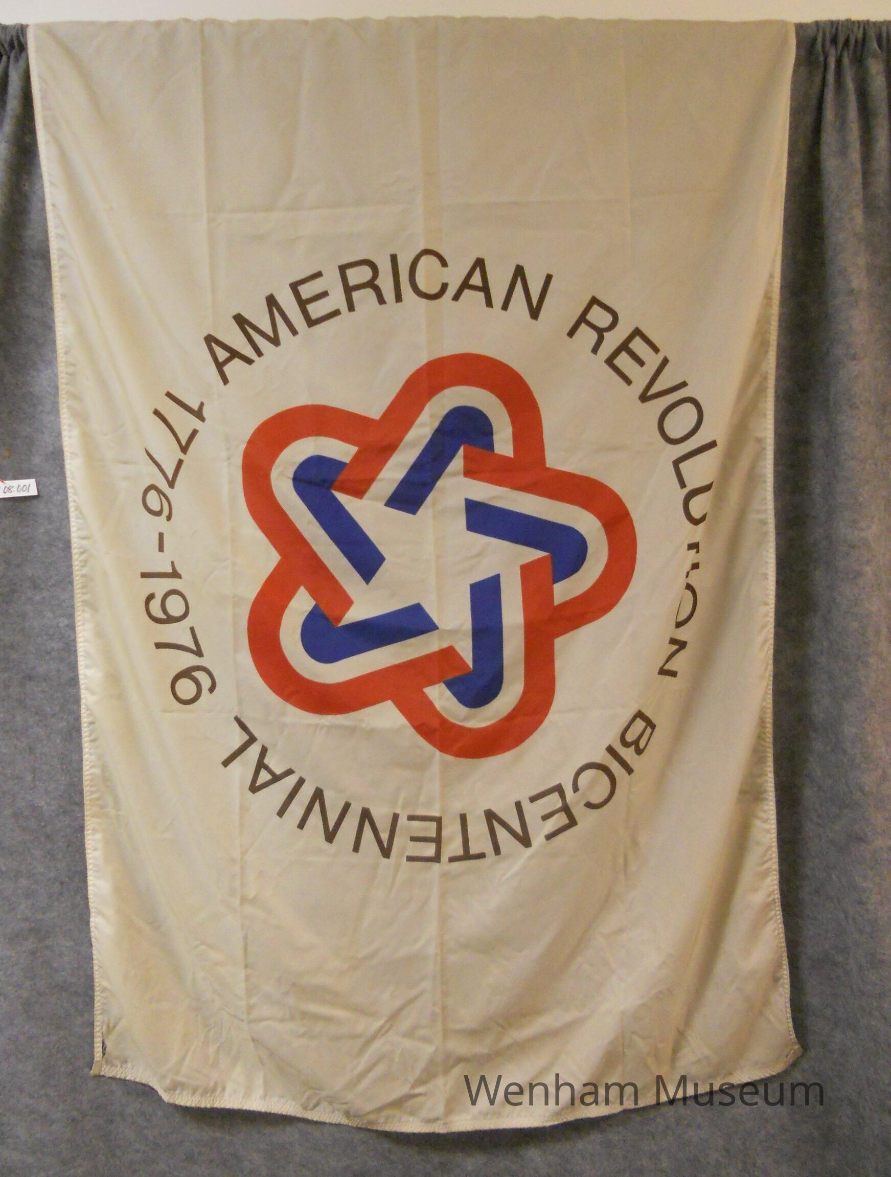Dacron banner for the Bicentennial celebrations of the Revolution. It is printed with a tricolor star design, developed especially for the Bicentennial, surrounded by the words: "American Revolution Bicentennial 1776-1976." One side is bound with white canvas with two metal grommets.