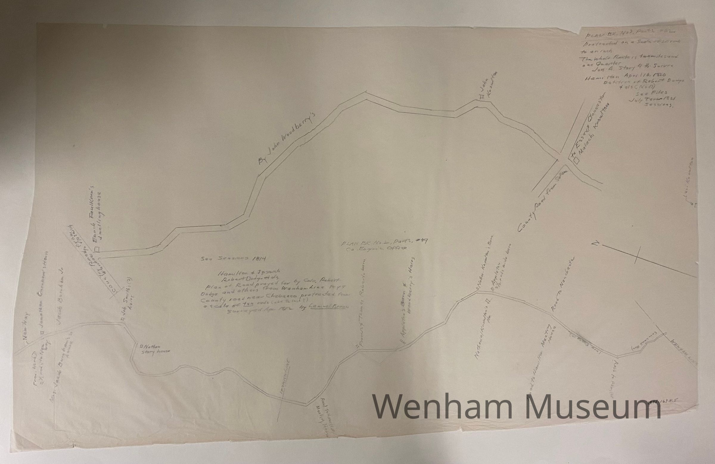Undated copy of map surveyed in April 1812 by Lemuel Brown of and area of Hamilton and Ipswich. The map covers 2 1/4 miles, according to a note on the top right corner. Plan of Road payed for by Colonel Robert Dodge and others from Wenham Line to County Road near Chebacco.
