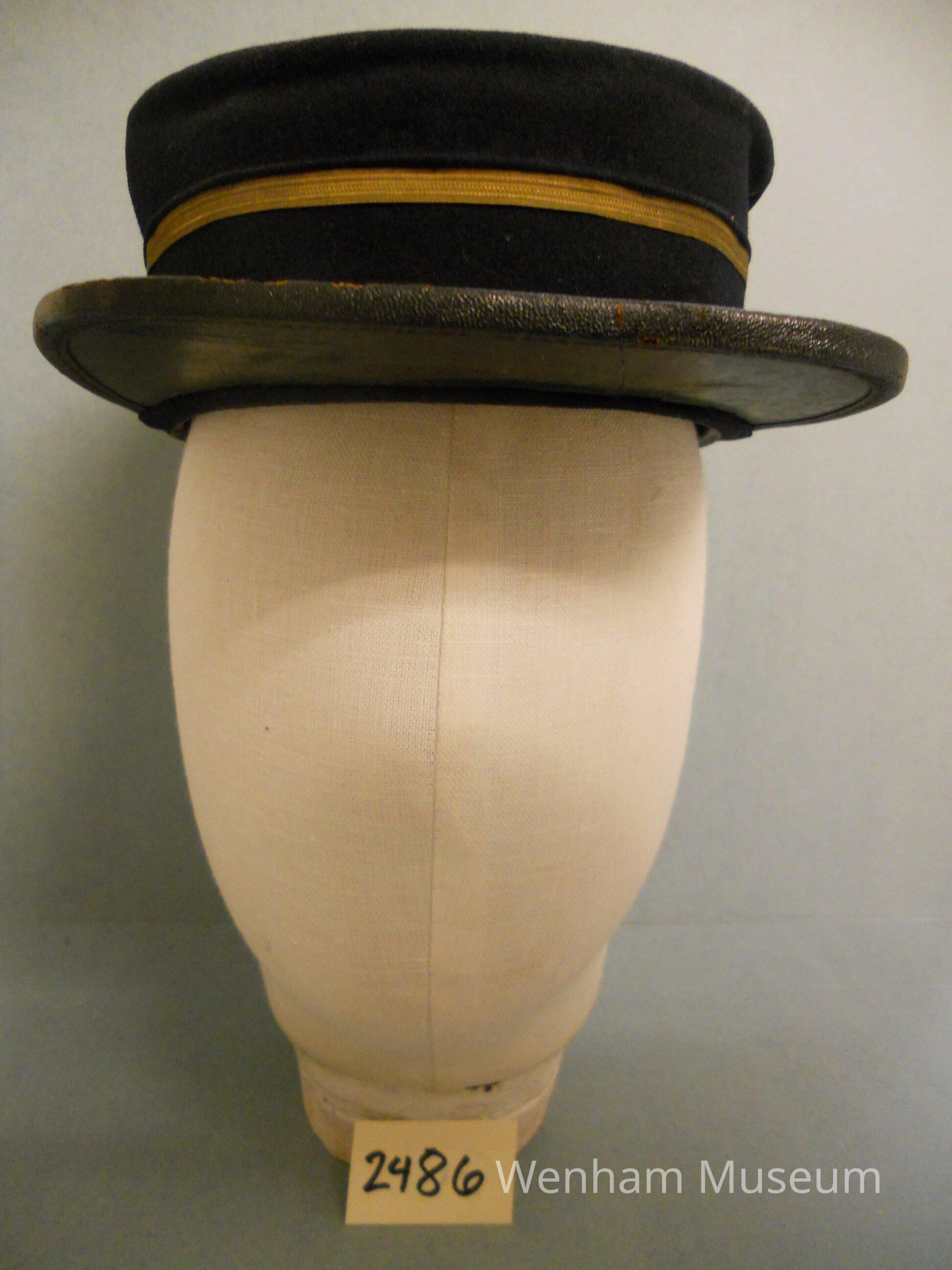 Conductor's cap in navy blue wool with gilt braid and a leather visor. In theory this hat was worn by conductors on the tram which ran through Wenham.