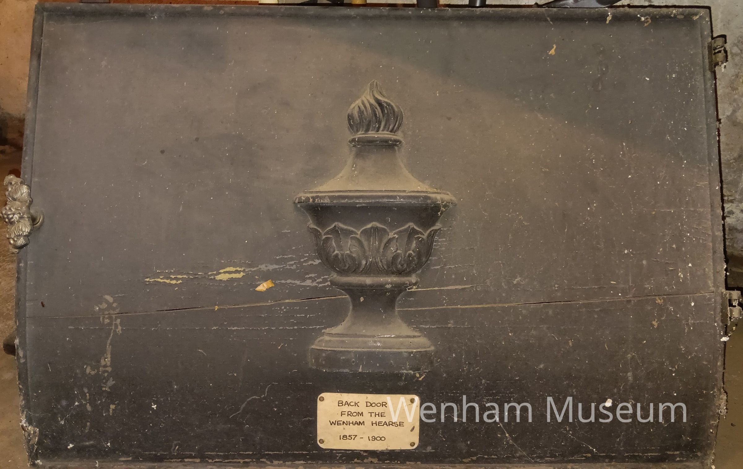 Black-painted wooden rear door of Wenham hearse used from 1857 to 1900.