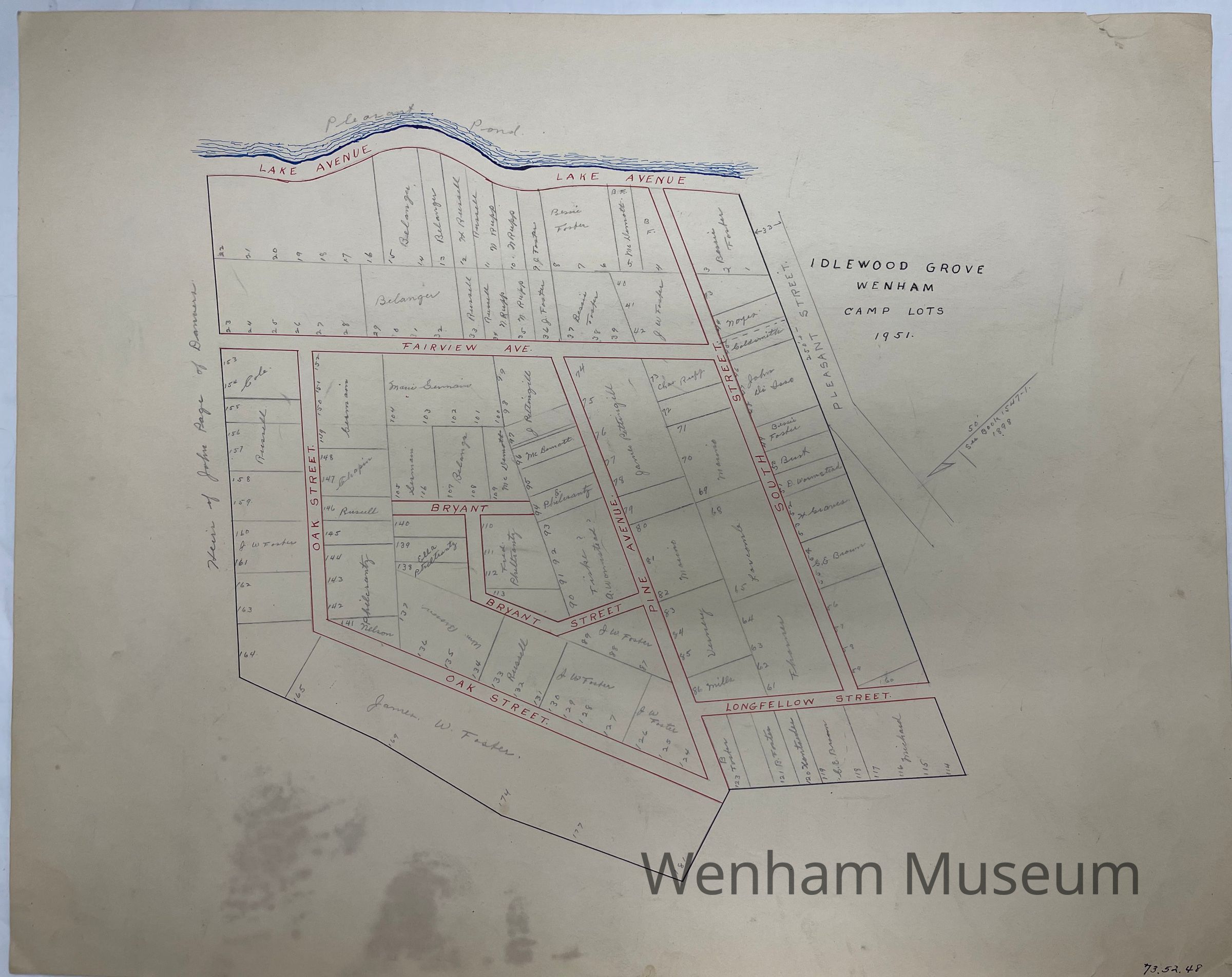 Idlewood Grove Wenham Camp Lots 1951 and area bounded by Pleasant Street, Oak Street and Lake Avenue. The lot owners are noted on the map.