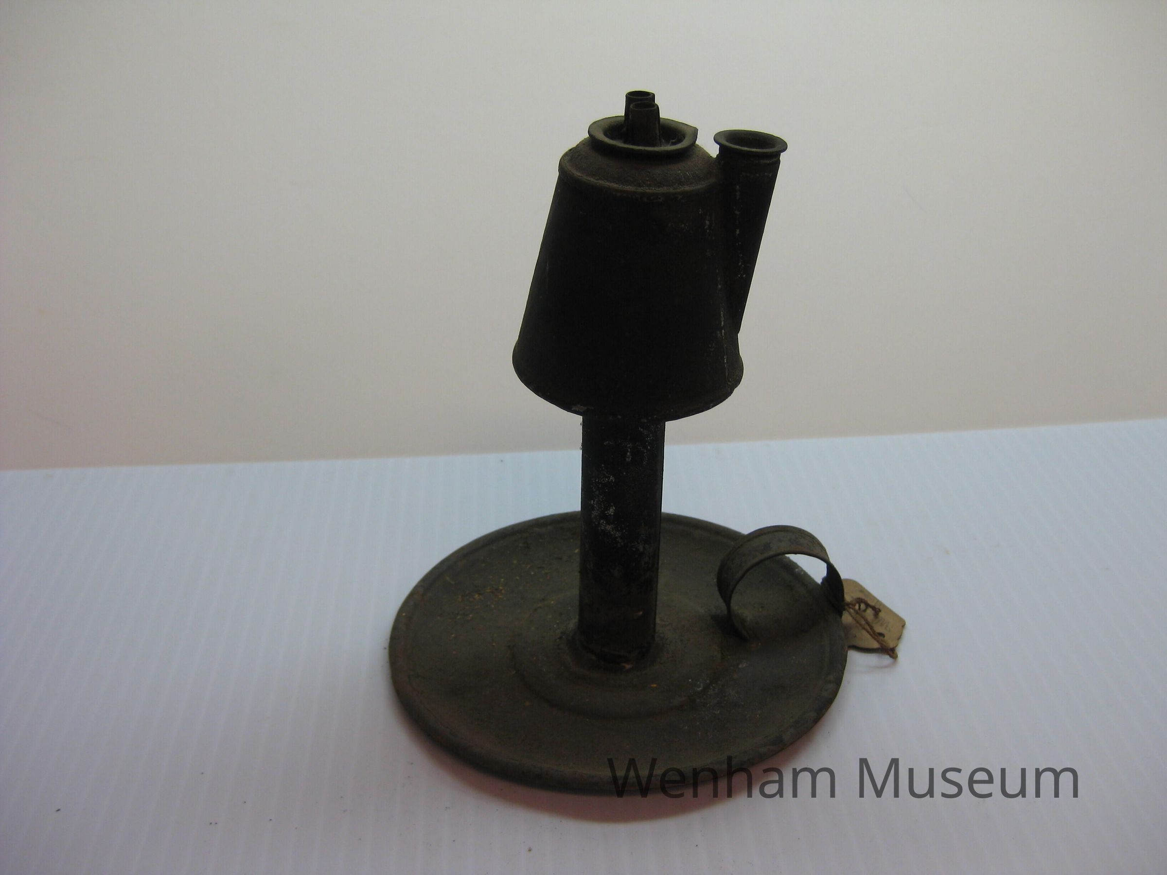 A tin oil lamp with a saucer-shaped base and an applied handle. The oil receptacle sits on a tube that is attached to the base, is shaped similar to a coffee urn, and has two narrow spouts for the wicks (missing). The handle on the saucer is "C" shaped and has edges that are folded up to prevent a sharp edge. Attached to the handle is an old white label that reads, "Nellie A. Dodge of Wenham, Mass.." The lamp shows evidence of black paint.