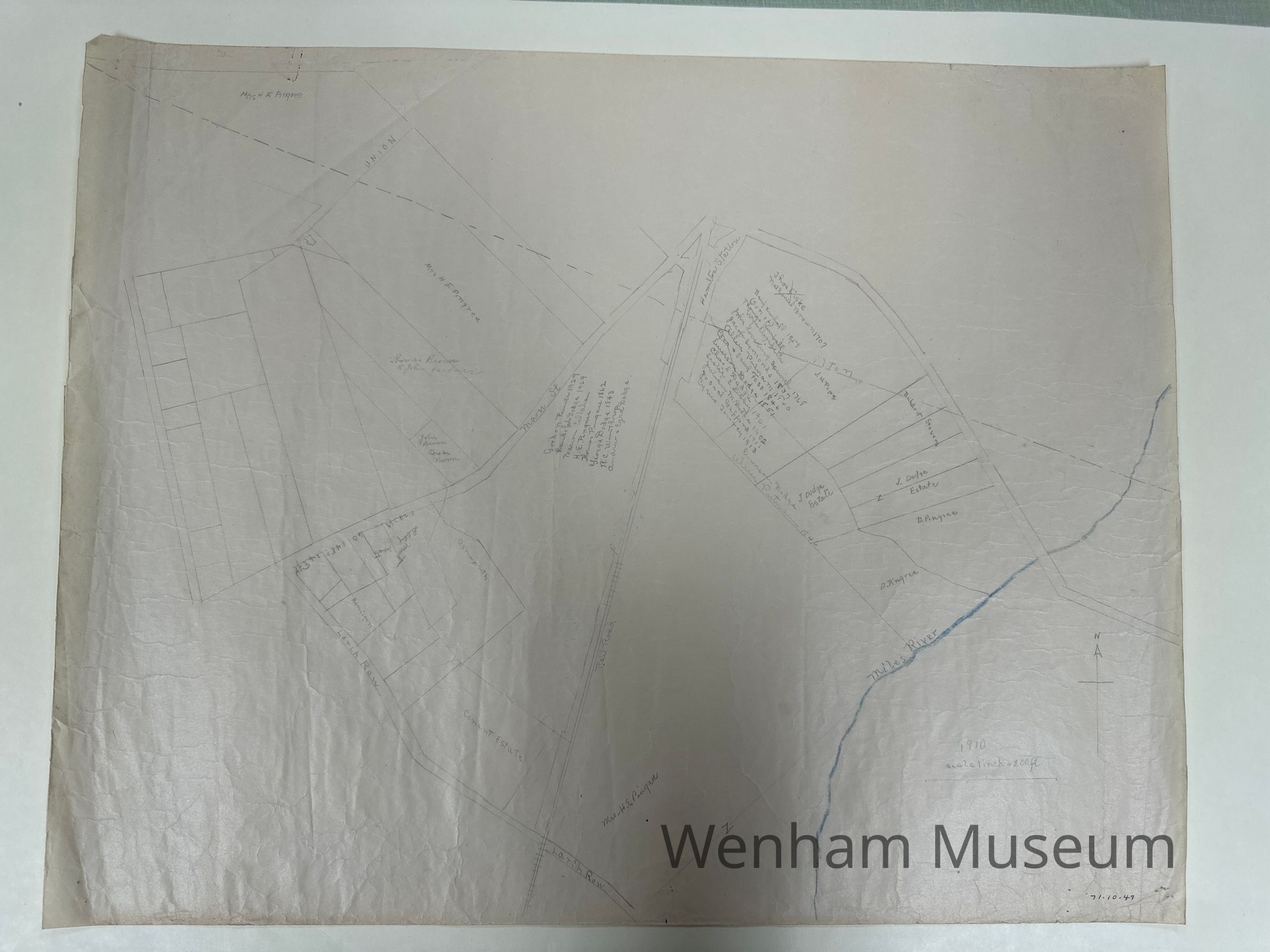 Dates of ownership in land of Wenham - Larch Row, penciled map of 1910, showing land ownership