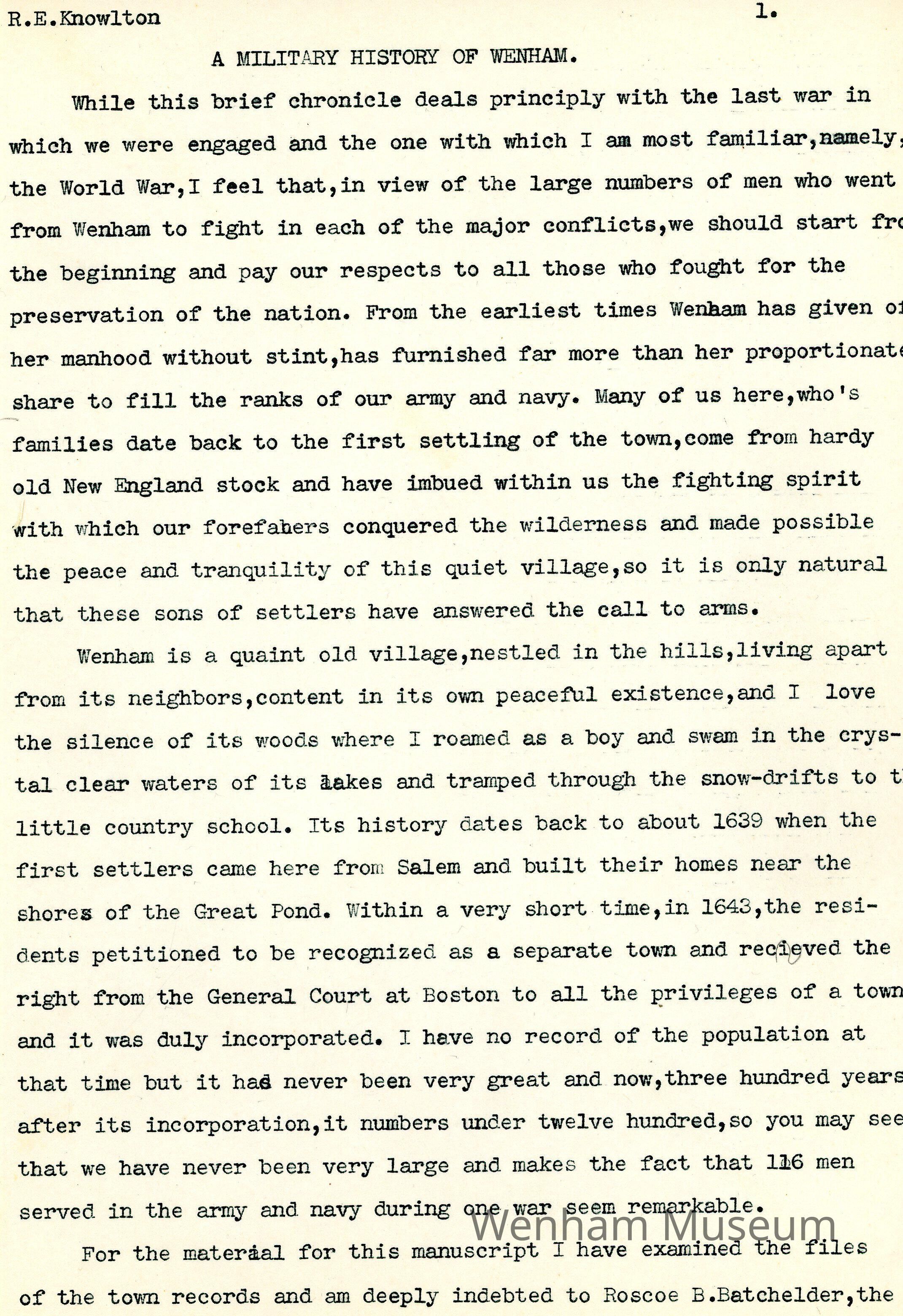 "Military History of Wenham" manuscript of 156 pages, written by Roger E. Knowlton (b 1899) in the 1930s. It looks at wars and Wenham residents participation from the 17th century (King Phillip's War) through World War I.
