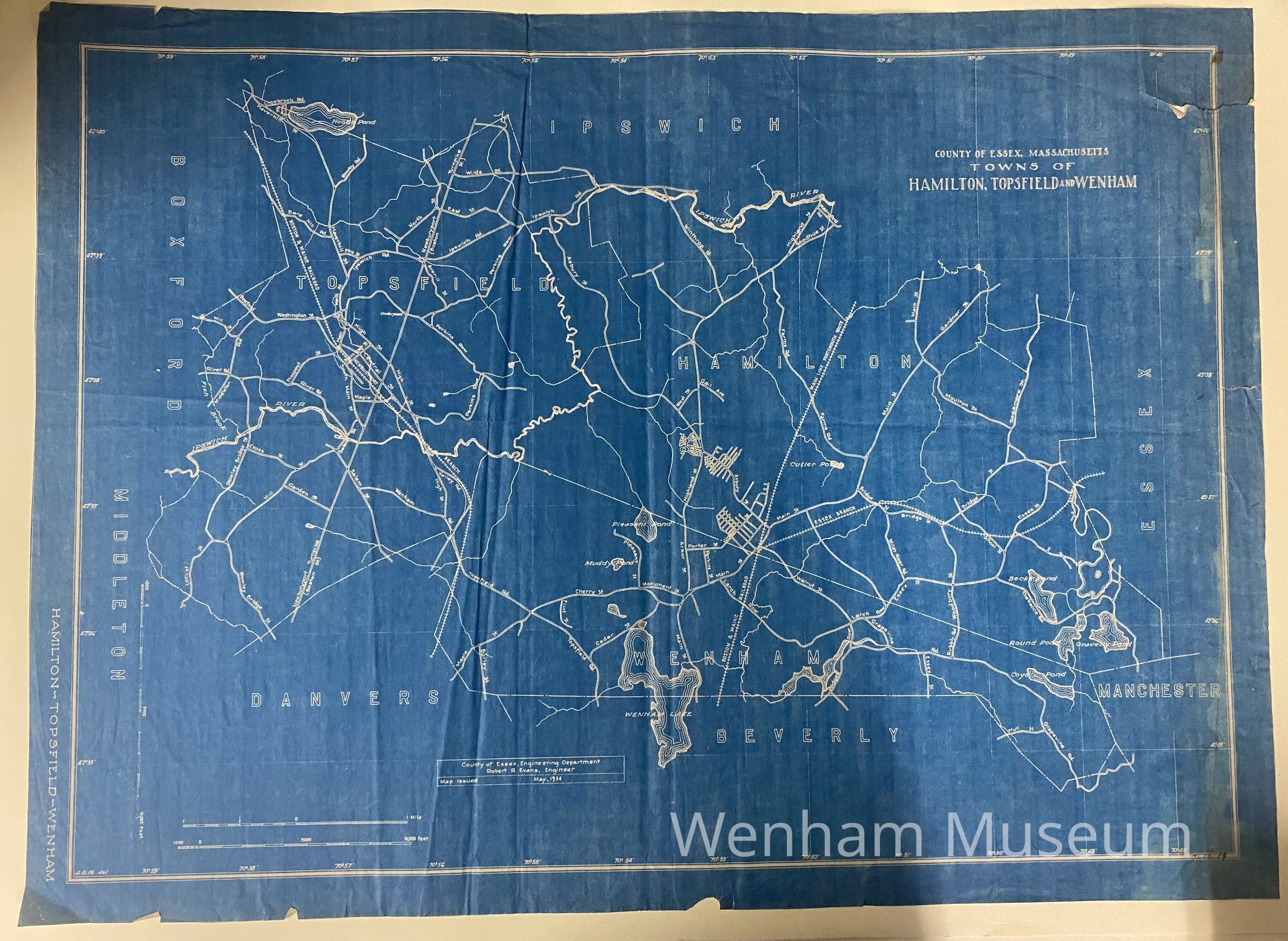 1934 map of Hamilton, Topsfield, and Wenham. The principle streets are labled and subdivisions are shown without the street names. Physical features like Wenham Lake and smaller ponds are shown, as is the railroad.