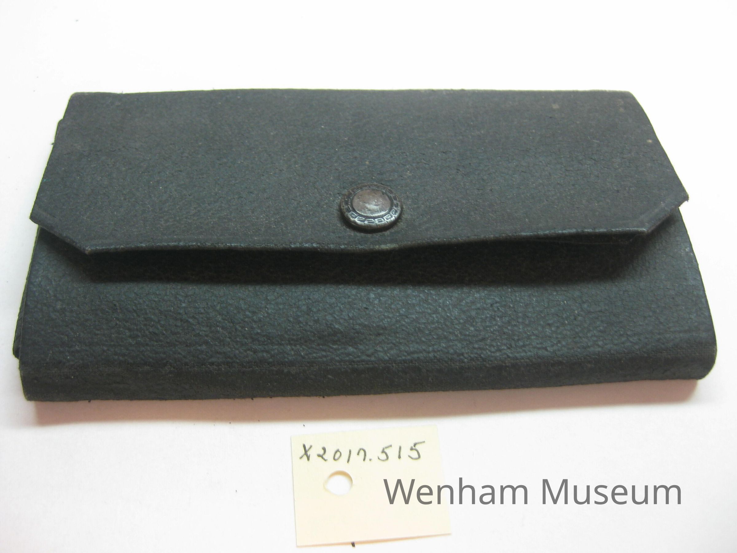 A folded leather case with a flap and button closure. Inside is double flap, one of which is printed in gold with "The Boston Regalia Co: 027 Washington St., Boston, Mass." Inside the double flap is a brass(?) medal or pendant in two sections connected with two short chains. On the top section is printed, "Hamilton-Wenham, No. 297." The bottom section, which is round, is embossed with a haystack, ax and shovel and "P M, Patrons of Husbandry."