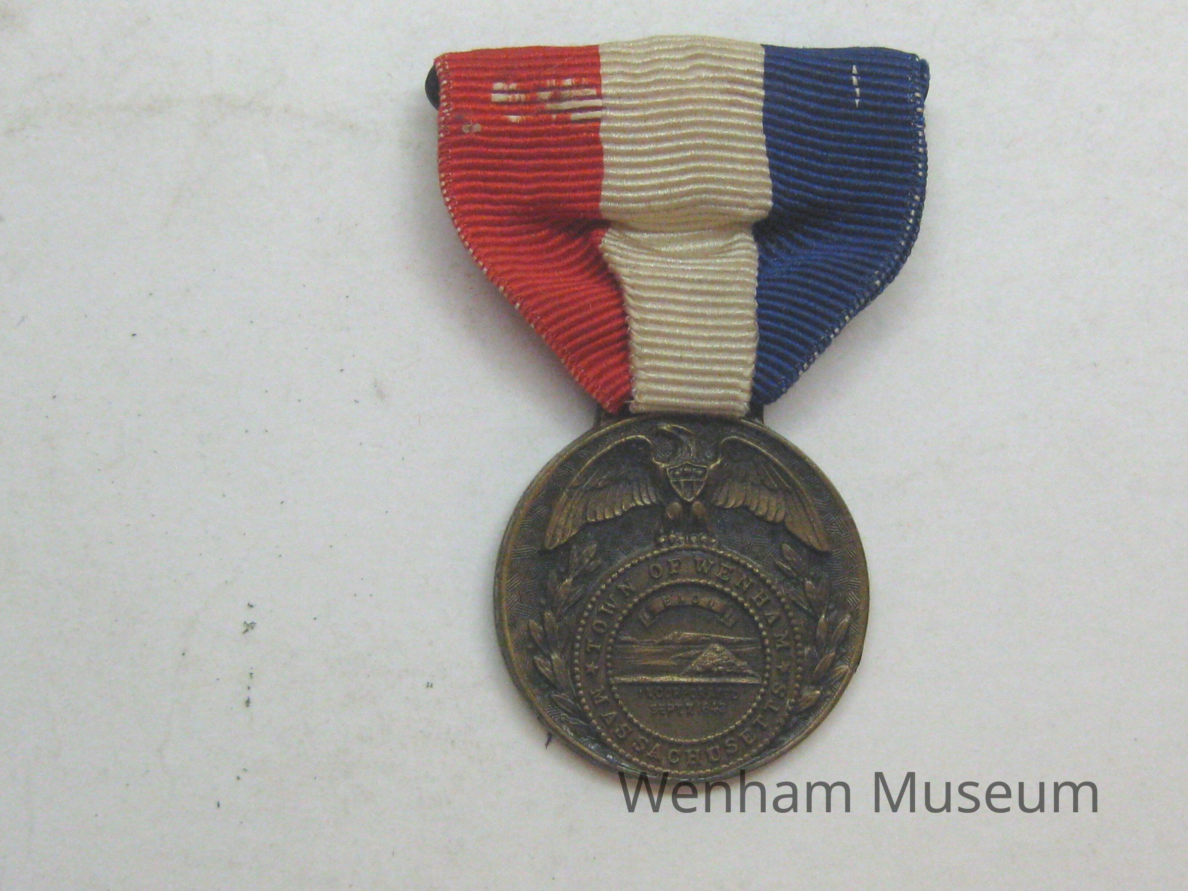 A medal attached to a red, white and blue ribbon and with a pin on the back, 1.625" x 2.375" (including ribbon). The medal is embossed with an eagle, below which is the seal of Wenham. On the back side is embossed, "United States Military Forces, 1914-1919" around the edge and in the center, "United States Military Forces / Presented to / Walter R. Reed / By the people of Wenham to / John C. Phillips / in / grateful recognition / of patriotic services / in the / World War / 1914-1919."