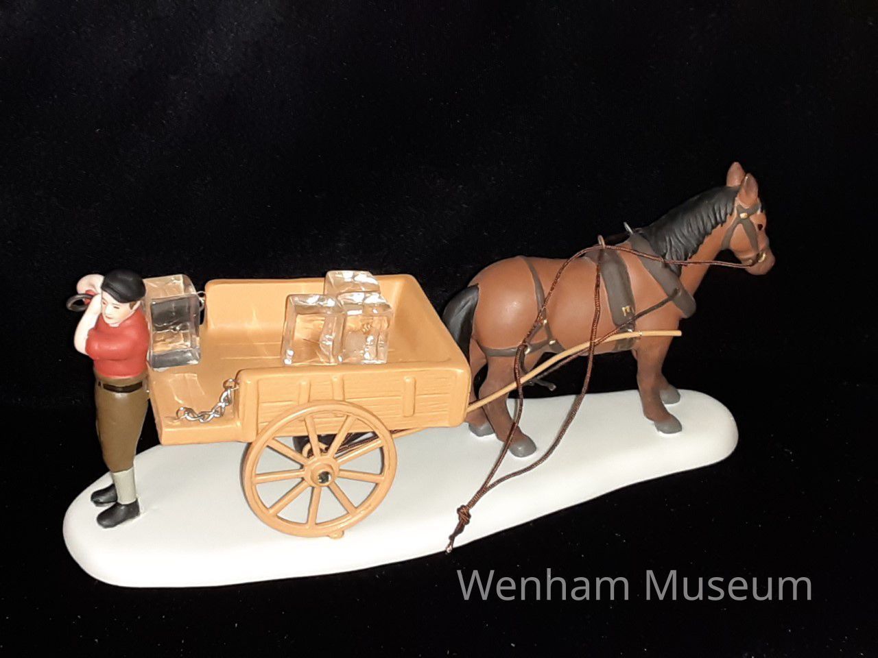 Molded and painted ceramic scene depicting a horse-drawn wagon carrying ice with a man wearing brown knickers and a red shirt carrying a block of ice on his back; manufactured by Department 56, in original box and packaging. The horse is brown with black mane and tail and black horse tack with gold trim, the wagon is molded and painted to look like raw wood, with 4 clear blocks of acrylic ice - 3 in the wagon and one on the back of the figure. Made in China, manufacturer's model number 4056658, copyrighted by Department 56 in 2017, MSRP $45.00; designed to pair with Department 56's "Wenham Lake Ice Company" ice house, manufacturer's model number 4056655 (see 2018.04.0001).
