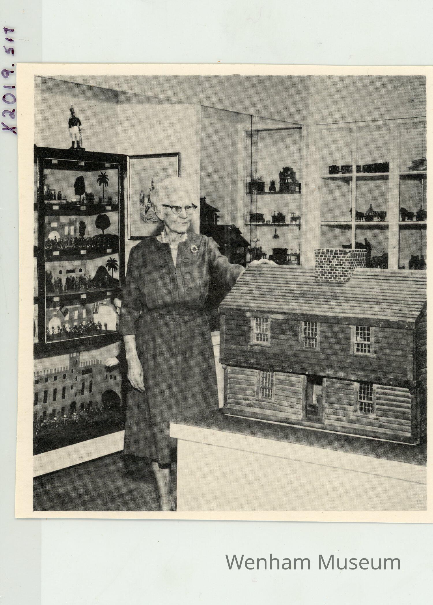 1967 photograph of Mary Osgood, (Mrs. Edward H. Osgood) in the "new Toy Room" of the Wenham Museum. The photo was published in the Evening News.