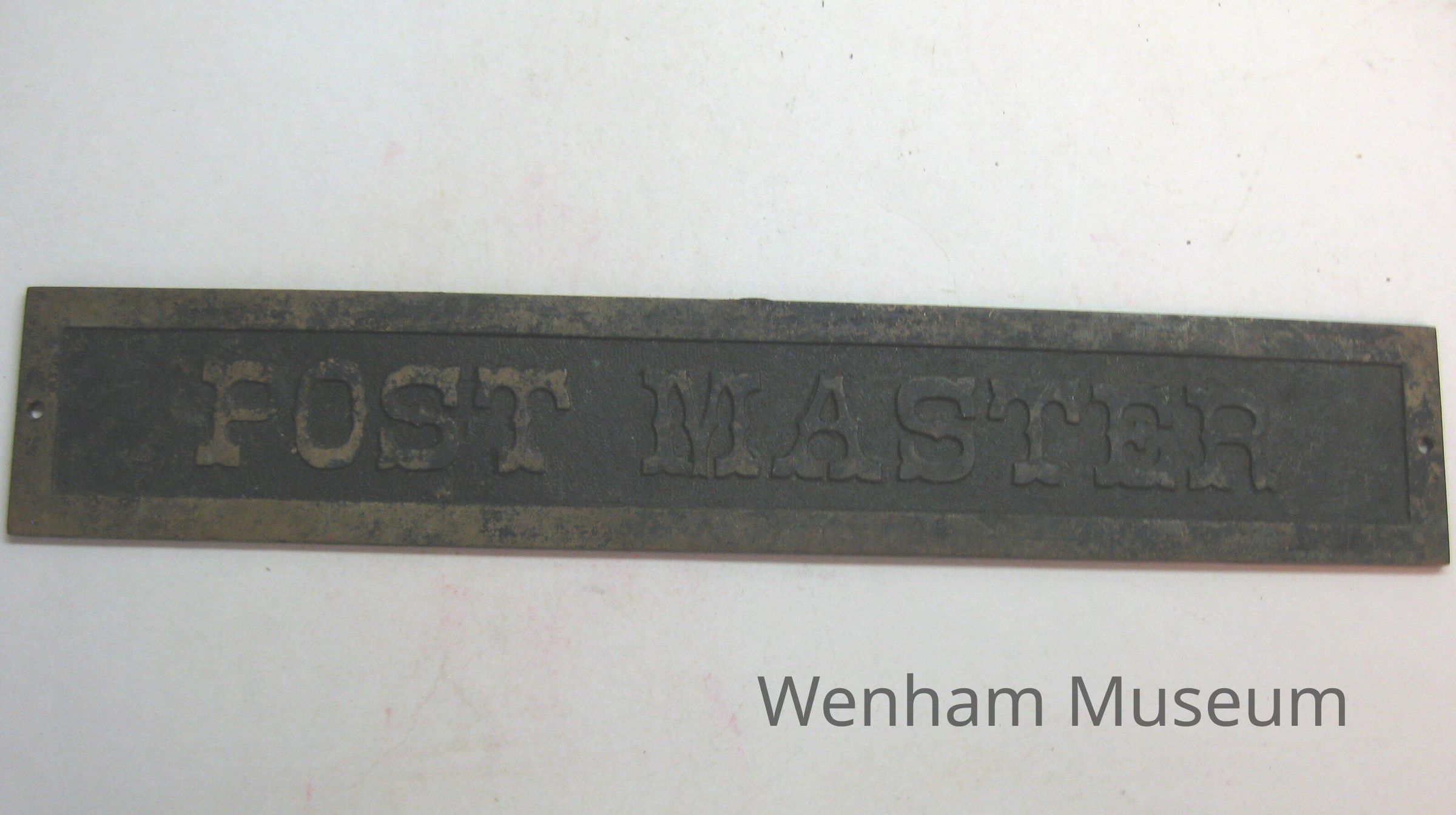 A brass 2.25" x 12.75" nameplate for the "Post Master" of the Wenham Neck Post Office. Part of a number of objects taken from Wenham post office building burned about 1936