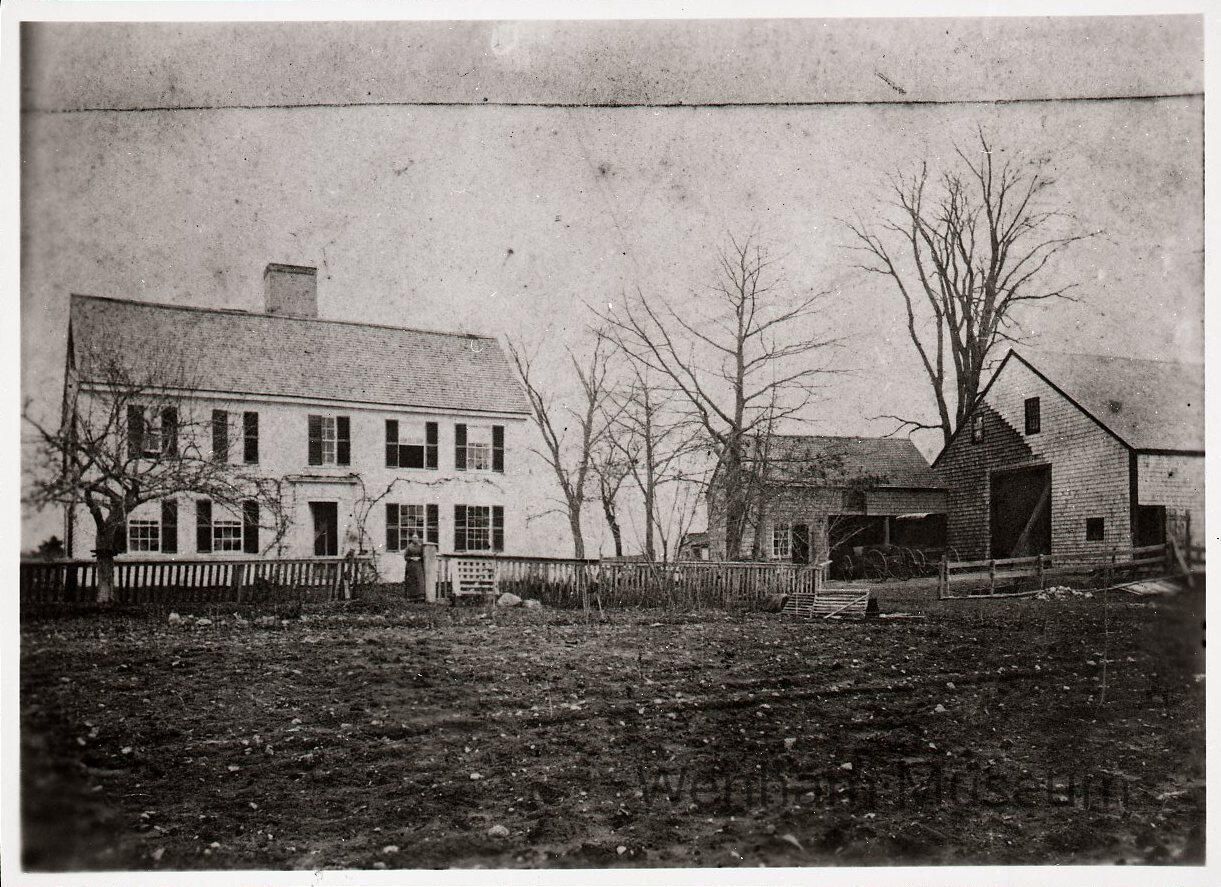 Black and white, medium format film negative frame, of the James T. Brown House and barn on Topsfield Road at the intersection with Flint Street, circa 1910. (8x10 and 5x7 print photographs in file)Collection