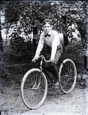 Fred Kilham photographed outside on a bicycle. It is his fourteenth birthday.