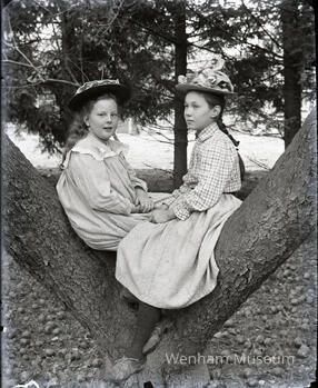 Mercy Abbott and Alice Cook sitting outside in the crotch of a tree. They both wear hats.