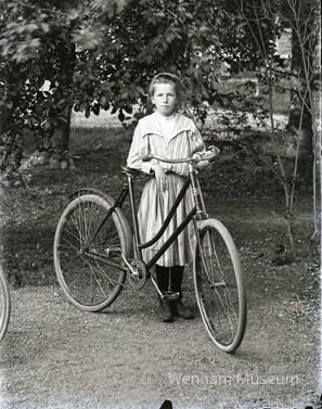 Ella Knowlton standing outside holding a bicycle.