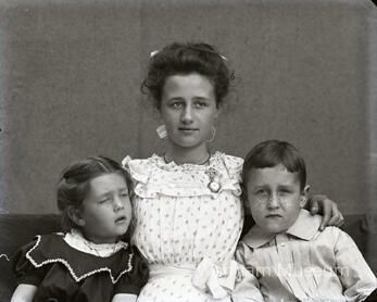 Portrait shot of Alice Wedger (from Melrose) with her younger brother and sister who are children. The photograph shows only the upper half of their bodies.Collection