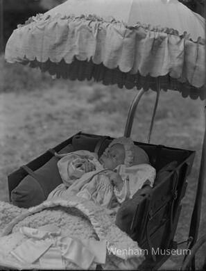 Bradford Trowt Crowell baby in carriage with attached parasol.