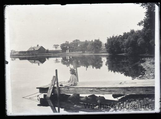 Landscape with girl on dock, Wenham Lake, copy of plate #49 taken 8/11/1890, Beards Barn in distance