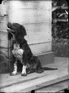 Annie Trask's dog Rover seated on step