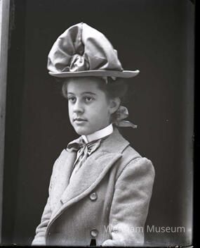 Portrait photograph of Carrie Lord in a large hat with a bow and in a well-fitted jacket.