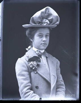 Portriat photograph of Carrie Lord in a hat with a large bow. She also has a floral brooch
