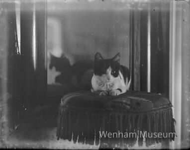 Conant's cat seated on a stool covered with a fringed cushion, 155 Main St.