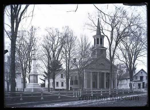 Landscape of Wenham Center, Main St. across park with H. Hobb's Harness Shop (135 Main St.), Wenham Congregational Church, (137 Main St.), Soldier's Monument and horse stable