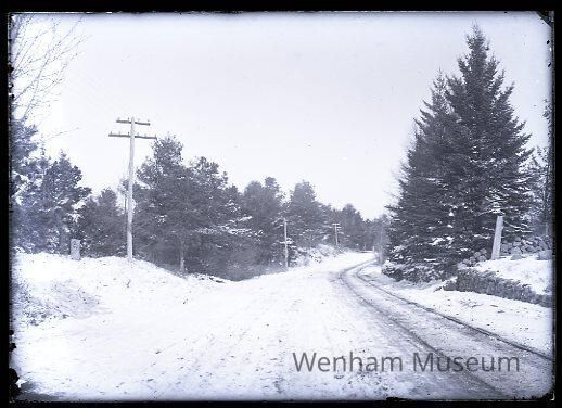 Winter landscape with snow, Enon St. & Main St., near Wenham Lake, No. Beverly and Wenham, (401a)