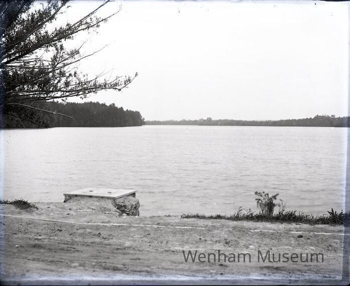 Landscape at Wenham Lakefrom Main St., foot of Pond Hill with Longham pipe entrance and showing flag in water (similar to plate x2017.301).Collection