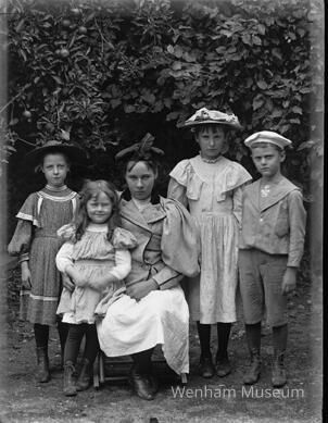 Group of five children: two Merrills, two from brick house, and Florence Alley.