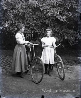 Carrie Lord and Edith Alley standing outside with bicycles.