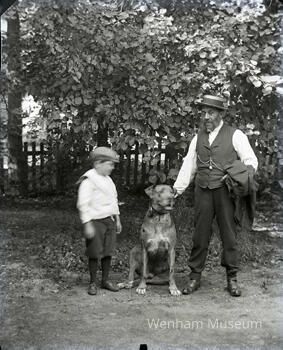 Mr. Howard with a boy and a dog standing outside.