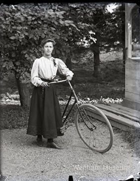 Laura Goodritge standing outside with a bicycle by a well.