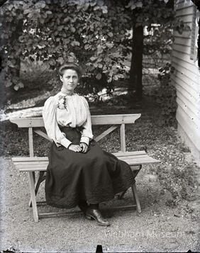 Laura Goodridge seated outside on a bench. She wears an interesting floral brooch.