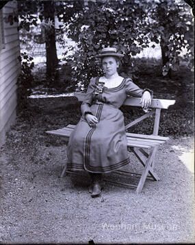 Rose Rollins seated outside on a bench. She wears a hat and an interesting brooch made of bows.
