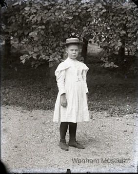 A picture of Ruth Perkins standing outside wearing a white dress and a hat.